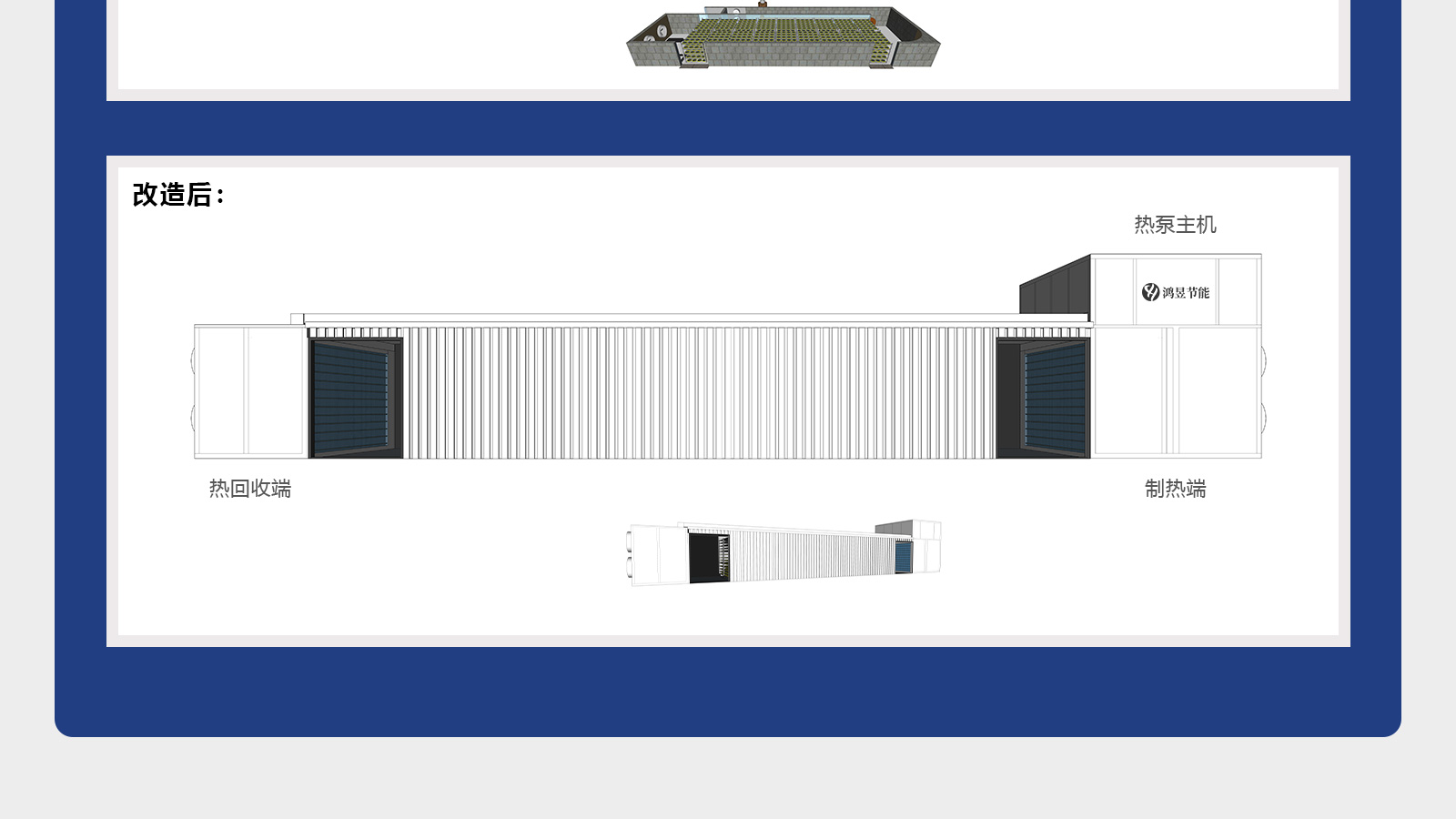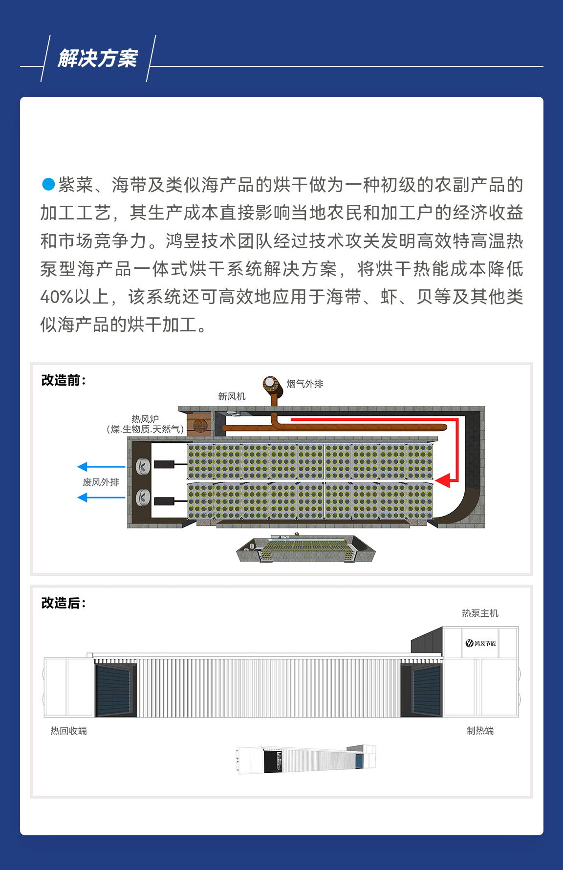 紫菜、海带及类似海产品的烘干做为一种初级的农副产品的加工工艺,其生产成本直接影响当地农民和加工户的经济收益和市场竞争力。鸿昱技术团队经过技术攻关发明高效特高温热泵型海产品一体式烘干系统解决方案,将烘干热能成本降低40%以上,该系统还可高效地应用于海带、虾、贝等及其他类似海产品的烘干加工。
